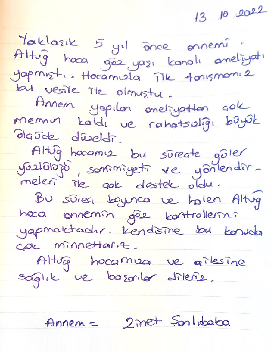 Bu süreç boyunca ve halen Altuğ hoca annemin göz kontrollerini yapmaktadır. Kendisine bu konuda çok minnettarız.