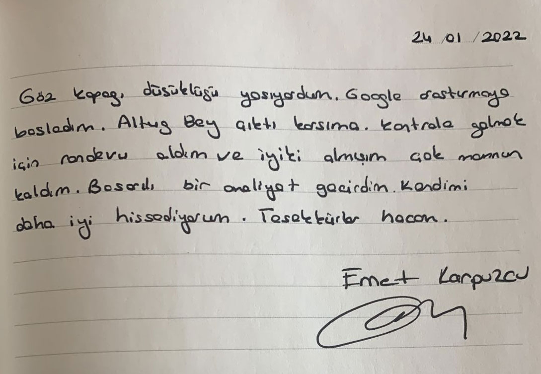 Göz kapağı düşüklüğü yaşıyordum. Google araştırmaya başladım. Altuğ Bey çıktı karşıma. Kontrole gelmek için randevu aldım ve iyiki almışım çok memnun kaldım. Başarılı bir ameliyat geçirdim. Kendimi daha iyi hissediyorum. Teşekkürler hocam.