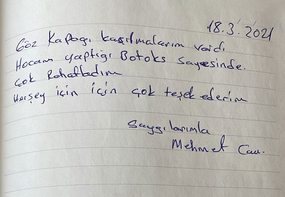 Göz kapağı kasılmalarım vardı. Hocamın yaptığı botoks sayesinde çok rahatladım. Herşey için çok teşekkür ederim.