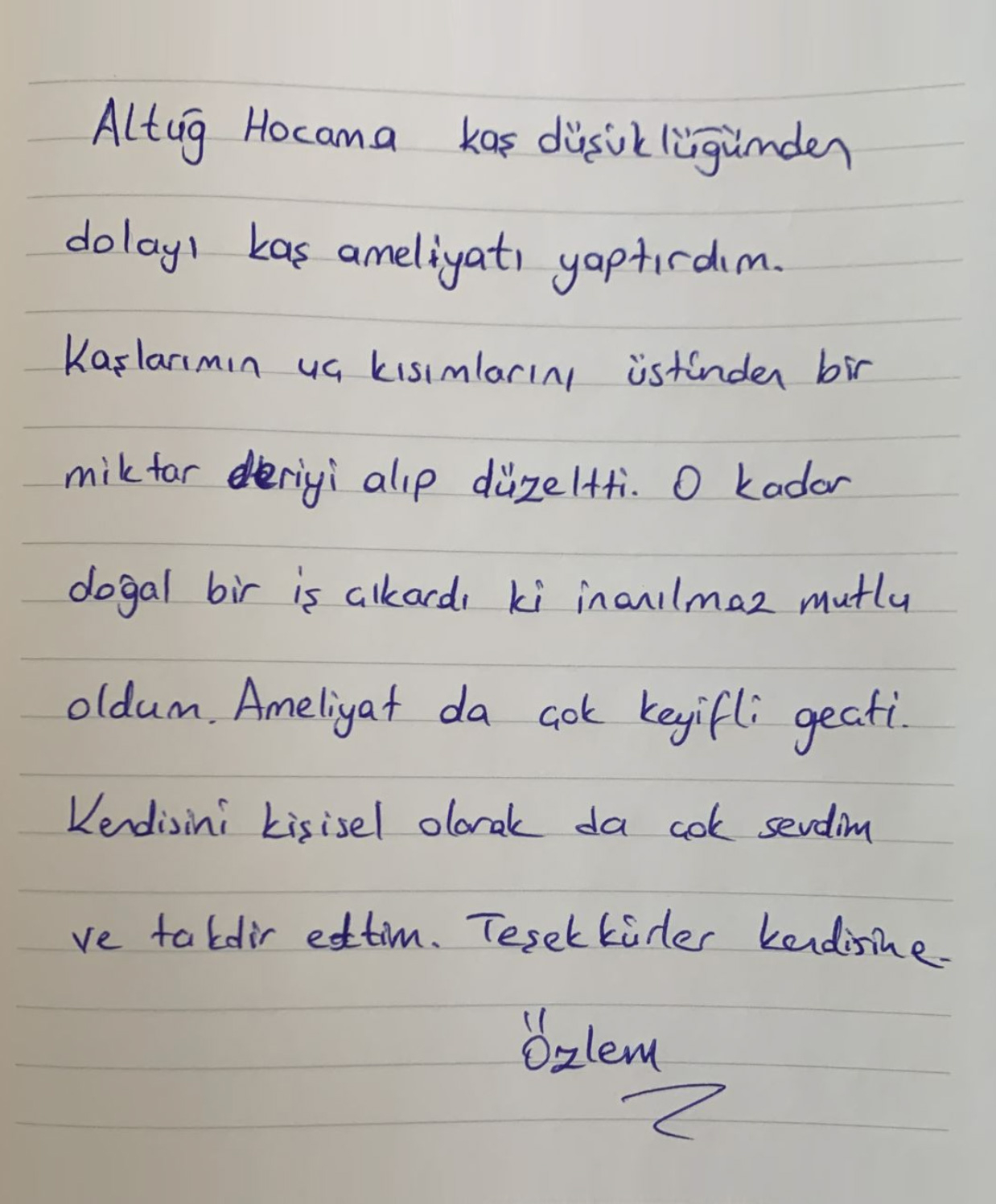 Altug Hocama kaş düşüklüğünden dolayı kaş ameliyatı yaptırdım. Kaşlarımın uç kısımlarını üstünden bir miktar deriyi alıp düzeltti. O kadar doğal bir iş çıkardı ki inanılmaz mutlu oldum. Ameliyat da çok keyifli geçti. Kendisini kişisel olarak da çok sevdim ve takdir ettim. Teşekkürler kendisine.
